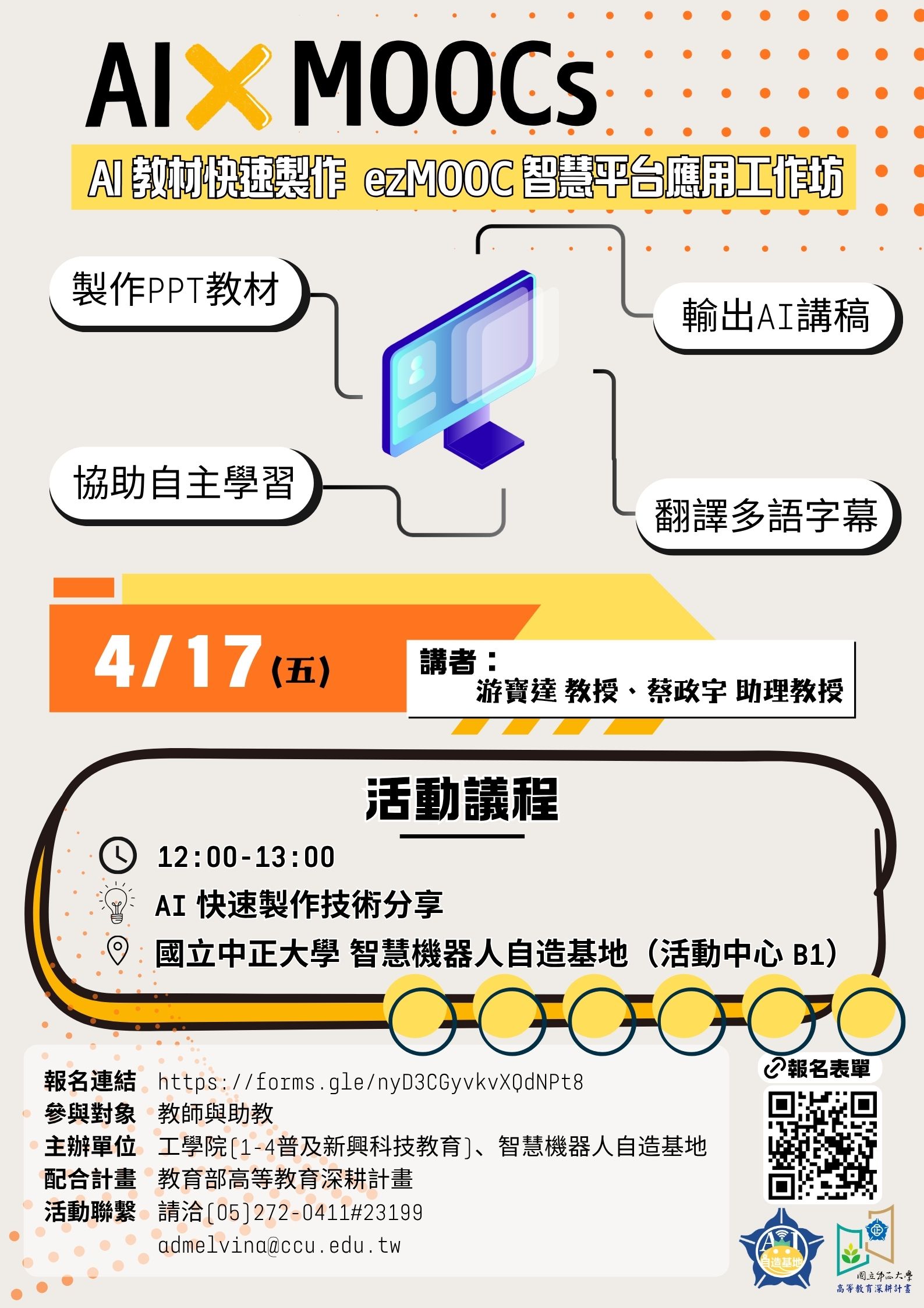 AI×MOOCs ——「AI教材快速製作:ezMOOC智慧平台應用工作坊」 活動內容:AI 快速製作技術分享暨現場指導操作 活動時間:115年4月17日星期五 下午12:00 - 13:00 活動地點:智慧機器人自造基地 參加對象:教師、助教、教職員同仁 【報名表單】https://events.lib.ccu.edu.tw/event/detail/list/1999/ 【主辦單位】工